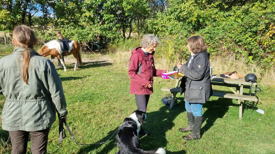 Vi havde en god tur med 7 heste og fik besøg af Charlotte og Henrik ved Høkeren hvor der var dejligt højt græs til hestene.